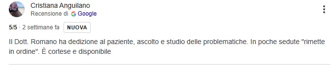 Elena Amaducci2025-04-08Trustindex verifica che la fonte originale della recensione sia Google. Conosco Davide tramite amici, come ho saputo del suo lavoro ho cominciato un percorso con lui a causa dei dolori alla schiena e successivamente al ginocchio, sono state esperienze risolutive grazie a questo ho fatto trattare le mie bambine e chiesto consulti per dubbi posturali ed è stato rassicurante ed efficace. Per quanto riguarda la nostra famiglia è stata un' ottima esperienza. Riccardo Delvecchio2025-04-03Trustindex verifica che la fonte originale della recensione sia Google. Ho iniziato ad andare da Davide perché mentre mi allenavo sentivo dolore a schiena e gambe, oltre a subire spesso infortuni muscolari giocando a calcio. Davide ha analizzato il problema a monte e l'ha ricondotto alla postura, per cui abbiamo iniziato a lavorare su quella, oltre a trattare i problemi che emergevano di volta in volta. A distanza di un anno e mezzo mi sento rinato, riesco a fare attività fisica tranquillamente senza dolore. Veramente bravo! Francesco Zoffoli2025-04-03Trustindex verifica che la fonte originale della recensione sia Google. Ottima professionalità e competenza. Mi sono fatto trattare per un problema al ginocchio destro (esito risonanza negativo) che si gonfiava appena lo sforzavo minimamente. Problema risolto in poche sedute. Kevin Barzanti2025-04-02Trustindex verifica che la fonte originale della recensione sia Google. Super professionale e disponibile. Da quando vado con regolarità non ho più accusato dolori di alcun tipo. L ho anche consigliato ad alcuni amici che sono rimasti molto soddisfatti! Andrea Ciani2025-04-01Trustindex verifica che la fonte originale della recensione sia Google. Un ottimo professionista, competente ed empatico. Ha individuato il mio problema relativo alla cervicale e risolto completamente! Lo consiglio vivamente, soprattutto per la minuziosa spiegazione e la professionalità. Giulia Zoffoli2025-03-28Trustindex verifica che la fonte originale della recensione sia Google. Molto professionale e competente. Mi sono rivolta a lui dopo un tamponamento con conseguenti problemi di cervicale e ho notato benefici già dalla prima seduta. Ho consigliato anche ad amici e parenti di provare da lui e i ritorni sono tutti molto positivi. Cristiana Anguilano2025-03-28Trustindex verifica che la fonte originale della recensione sia Google. Il Dott. Romano ha dedizione al paziente, ascolto e studio delle problematiche. In poche sedute "rimette in ordine". È cortese e disponibile Lucia Iannaccone2025-03-27Trustindex verifica che la fonte originale della recensione sia Google. Grazie al dott. Romano sono tornata a correre e a fare sport. Ho speso un sacco di soldi tra neurologi, fisioterapisti e specialisti vari perche mi si addormentava la gamba durante gli allenamenti e nessuno capiva il perché. Come ultimo tentativo, ormai sfiduciata e senza speranze, mi sono affidata a lui su consiglio di un amico. Ora, dopo diverse sedute e unendo determinati esercizi NON HO PIÙ PROBLEMI. Con tutto il cuore, grazie! Andrea Apparuti2025-03-26Trustindex verifica che la fonte originale della recensione sia Google. Mi sono rivolto al dott. Davide Romano per un persistente dolore alla zona lombare che spesso mi affliggeva e devo dire che è stata la scelta migliore che potessi fare. Fin dalla prima visita, si è dimostrato estremamente professionale, attento e competente. Ha saputo individuare la causa del mio problema ed ho ottenuto un miglioramento significativo già dopo poche sedute, potendo riprendere l'attività fisica che avevo dovuto abbandonare. Oltre alla sua grande preparazione, ho apprezzato molto la sua disponibilità. Consiglio vivamente il dott. Romano a chiunque cerchi un professionista serio e preparato.Carica di più